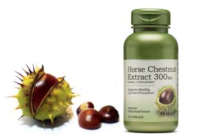 Horse chestnut (Aesculus hippocastanum) is a large, round-shaped tree growing to about 25-30 metres in height. Horse chestnut is also known as Rosskastanien, Buckeye, Chestnut, Escine, Hippocastani Cortex, Hippocastani Flos, Hippocastini folium, Hippocastani Semen, Marron Europeen, Marron dInde, or Spanish chestnut. Aescin or escin is a mixture of saponins with anti-inflammatory, vasoconstrictor and vasoprotective effects found in Aesculus hippocastanum (the horse chestnut). Aescin is the main active compound in horse chestnut, and is responsible for most of its medicinal propertie